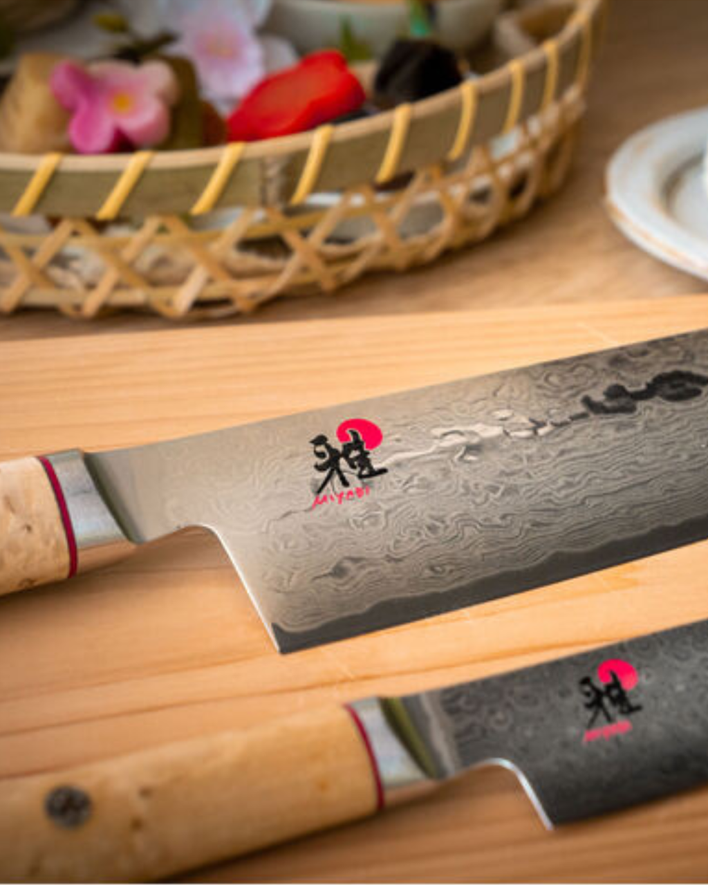 Pièce d’exception, le Santoku MIYABI Birchwood 5000MCD (18 cm) marie un cœur de lame en poudre d’acier MicroCarbide MC63 à un habillage Damas 100 couches au motif “flower”. Résultat : un tranchant chirurgical, une tenue d’arête ~63 HRC (trempe CRYODUR) et une glisse ultra-douce au quotidien.