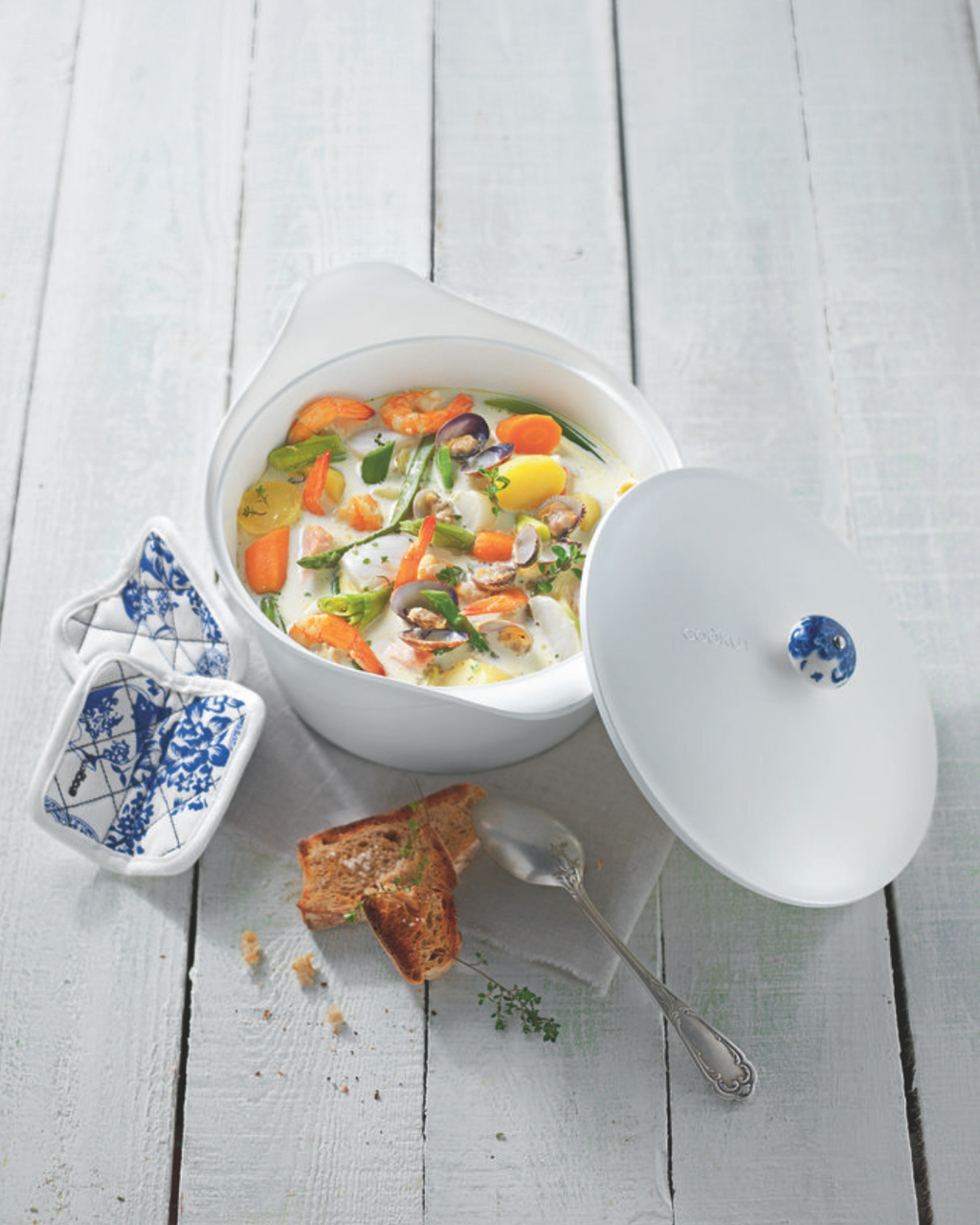 Attention : la cocotte est livrée avec un couvercle sans poignée. Poignée et maniques vendues séparément.
